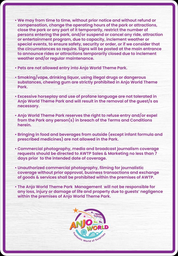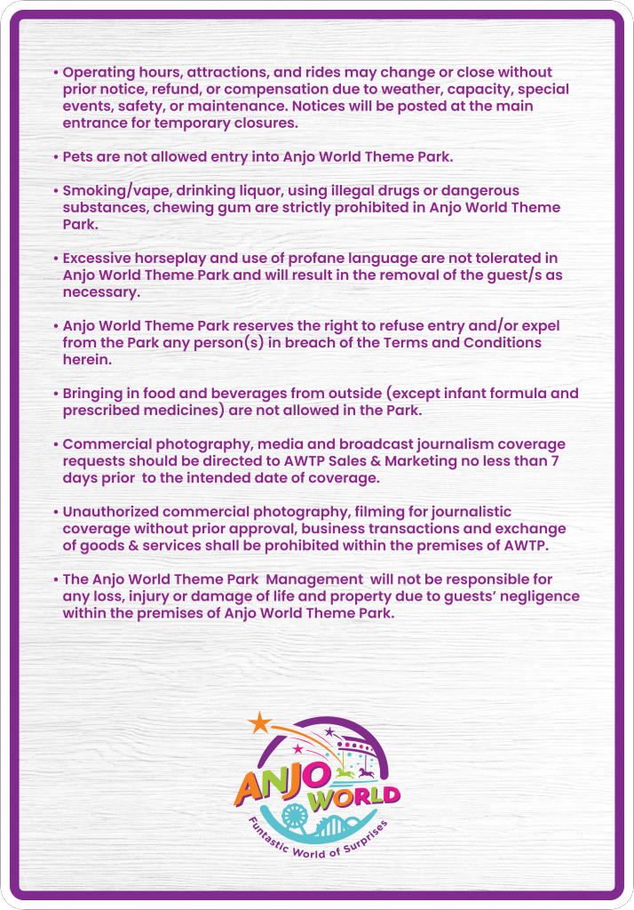 Management is not responsible nor liable for any damage or loss of guest’s property or belongings, within the premises of the park. The guests are responsible for their personal belongings while inside the park. Disorderly behavior and or profanity will not be tolerated inside the park and will be advised to leave the park with no refund or compensation. Please supervise your children while inside the park.