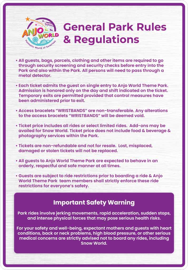 Park rides involve jerking movements, rapid acceleration, sudden stops and intense forces that may be risky during pregnancy. As your safety and health is top of our priority, expectant mothers are advised not to board any ride including Snow World.